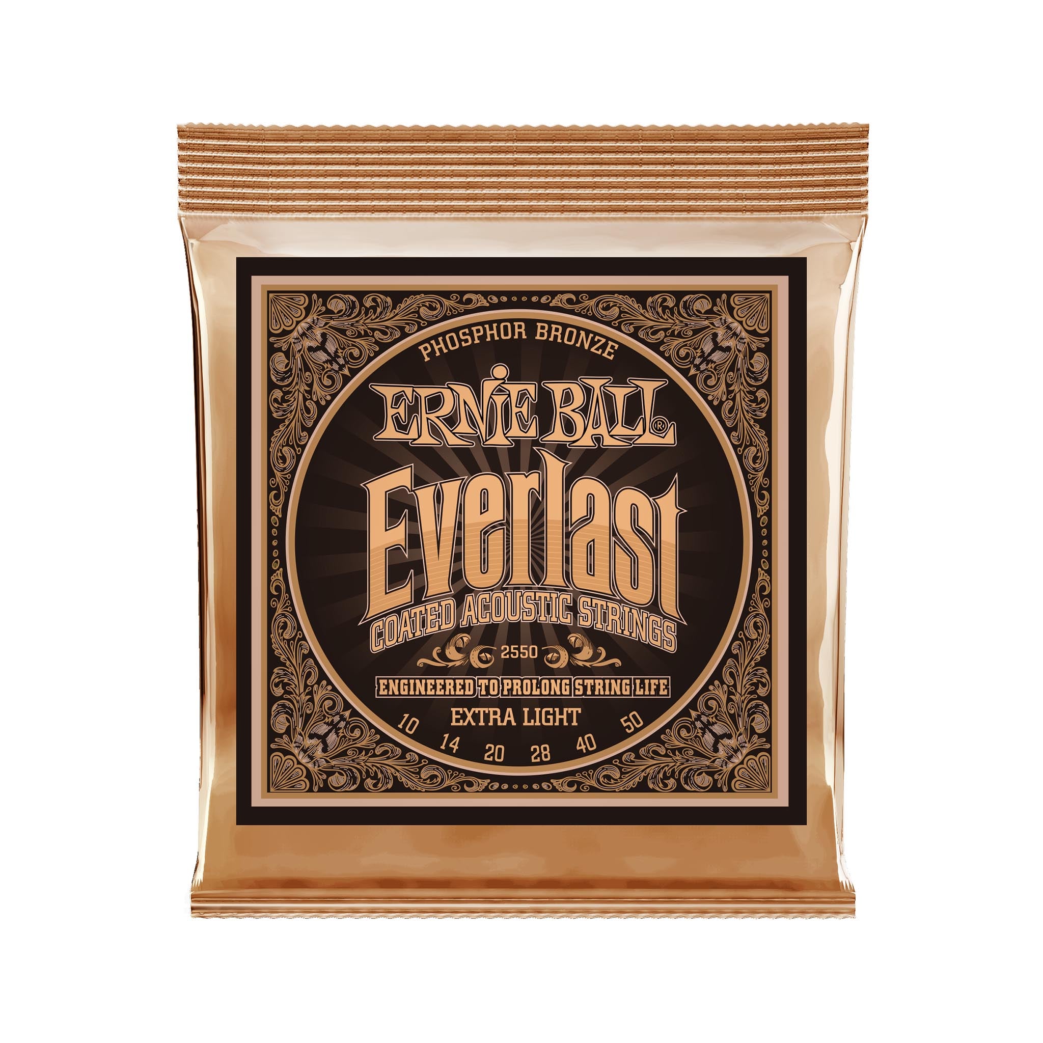 Ernie Ball Everlast Coated acoustic guitar strings use groundbreaking nanotechnology that repels unwanted moisture and oils that negatively impact your tone. Our proprietary treatment is applied to both the inner hex core and outer wrap wire to provide ultimate protection without compromising tone or feel. Made from 92% copper, 7.7% tin, 0.3% phosphorus wire wrapped around brass plated hex shaped steel core wire, Phosphor Bronze strings produce warm rich bass tones with clear bright trebles. Gauges .010, .014, .020, .028, .040, .050.