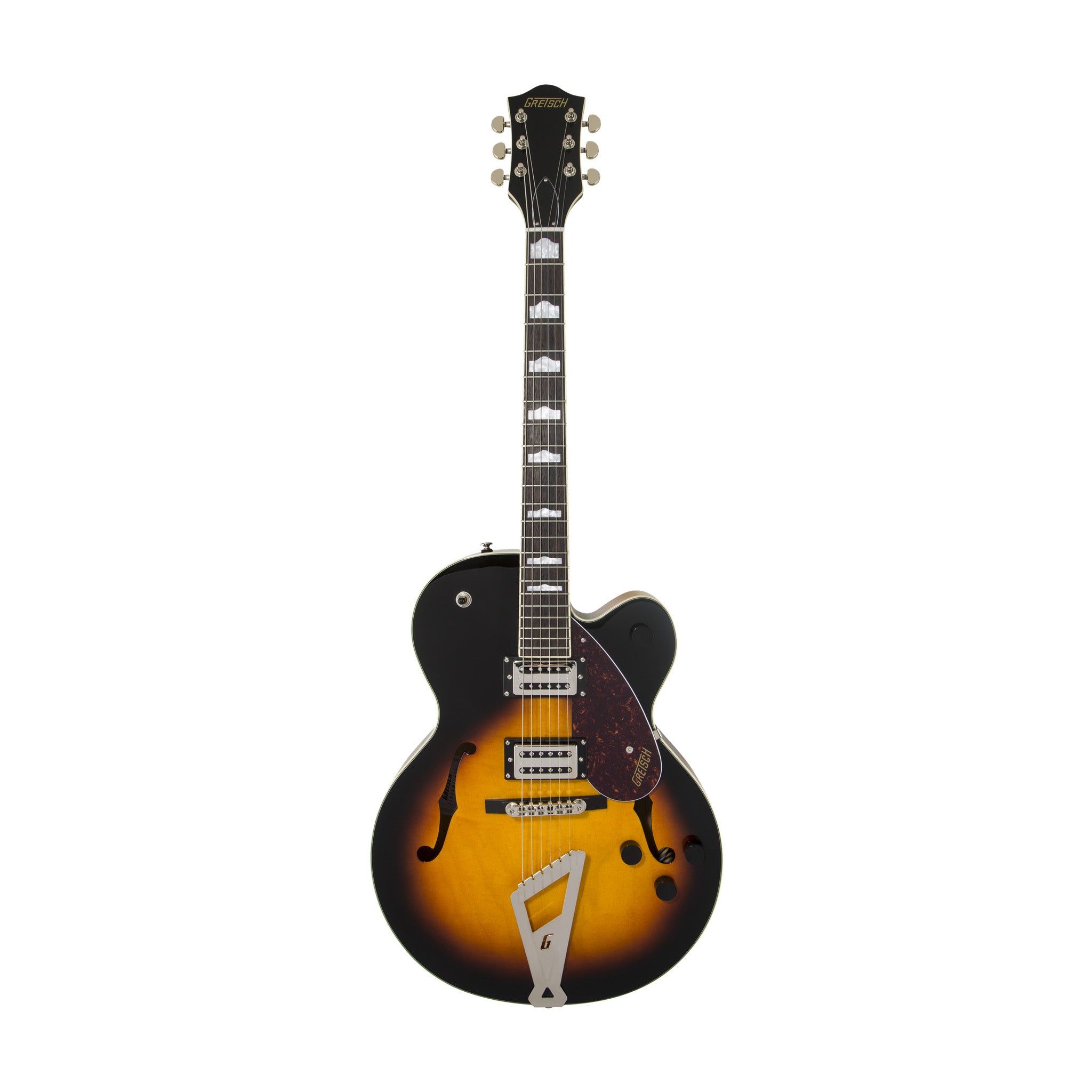 All the classic eye-catching style you’ve come to expect from Gretsch is here—vintage-style black control knobs, enlarged F-holes for increased acoustic projection, elegant aged white binding with upgraded purfling, slick-looking nickel hardware, arched laminated maple construction and three-ply tortoise pickguard.